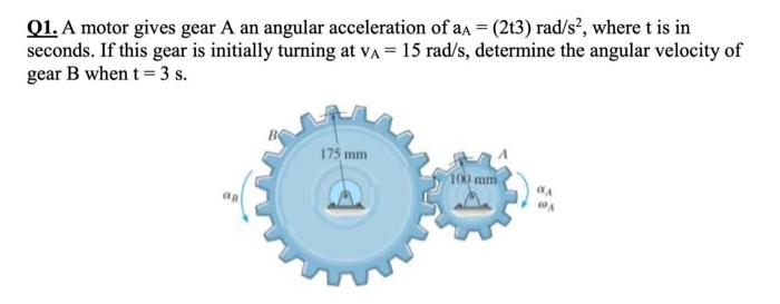. A motor gives gear A an angular acceleration of α A 2 t 3 alpha_A2 t3 α A 2 t 3 rads 2 2 2 where t is in seconds. A motor gives gear A an angular acceleration of α A 4 t 3 rad s 2 where t is in seconds. L v A 15 rads dv L t 0.