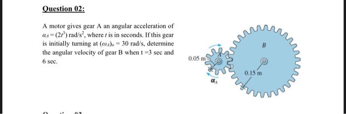 A motor gives gear A an angular acceleration of α A 2 0006 θ 2 r a d s 2 where θ is in radians. Engineering Mechanical Engineering QA Library Q3. If this gear is initially turning at ω A 0 20 r a d s determine the.